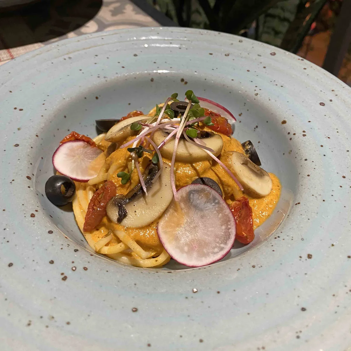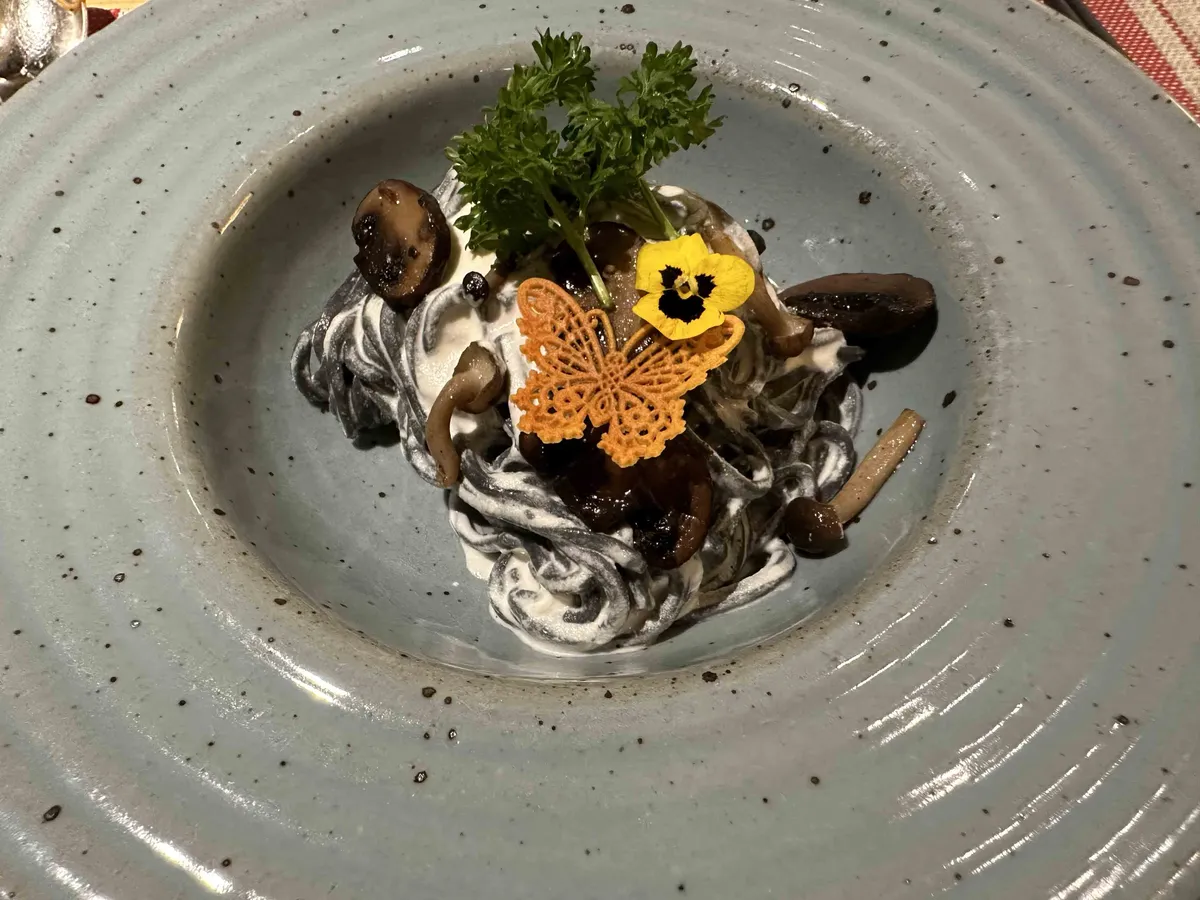 bamboo charcoal noodles with creamy mushroom sauce.