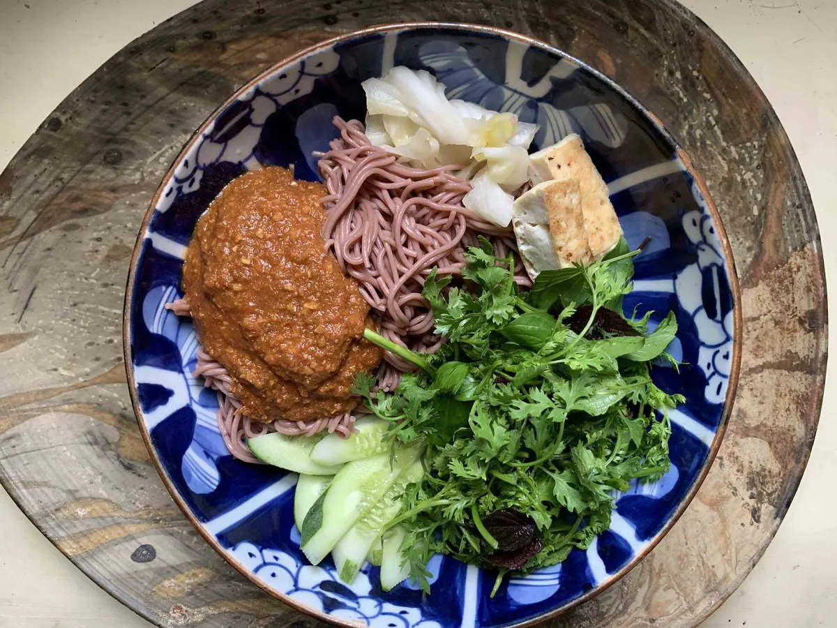 my brown rice noodle with homemade tomato-peanut sauce.