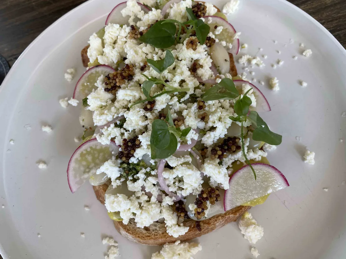 l- baked focaccia and sent me some for lunch with what looks like honey brie butter and pistachio butter.