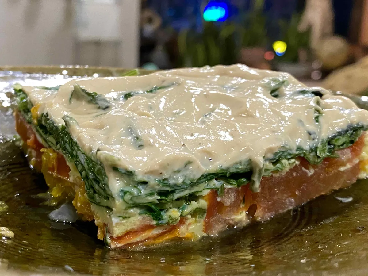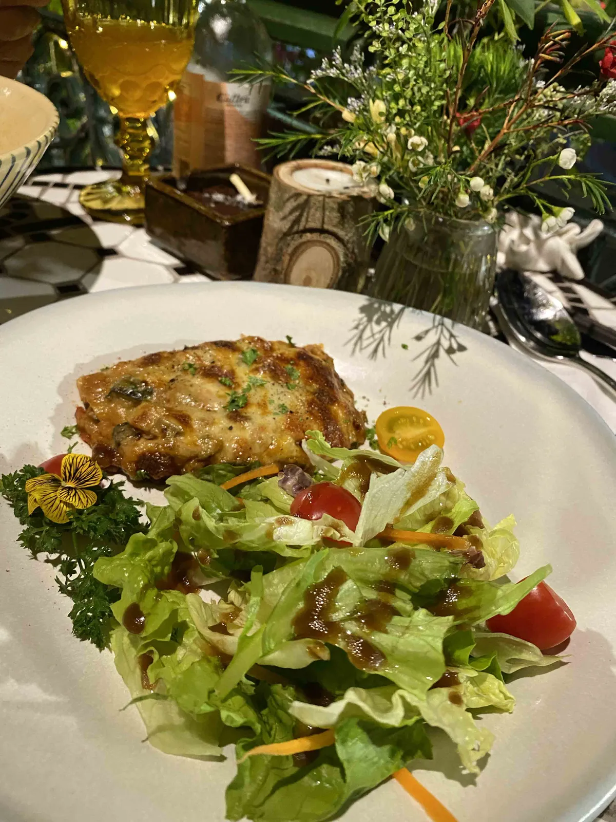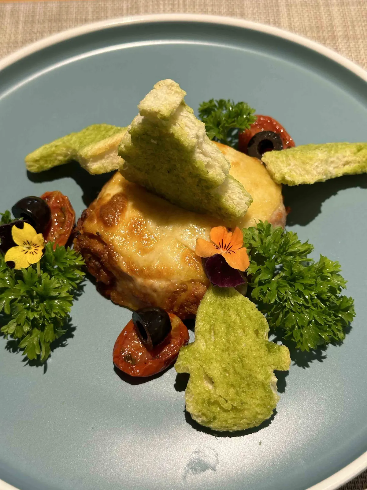a tiny pine sitting on my lasagna.