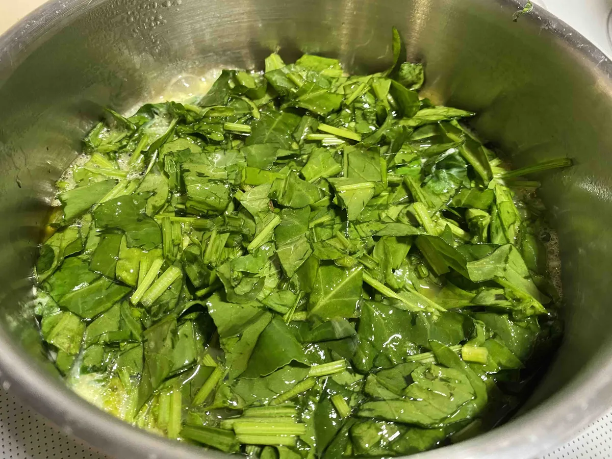 then pour the beaten eggs over the veggies. I like to mix in some chopped spinach with the eggs - just my preference. Lower the heat and let it cook with the lid on until done then enjoy!