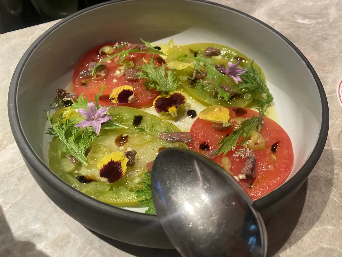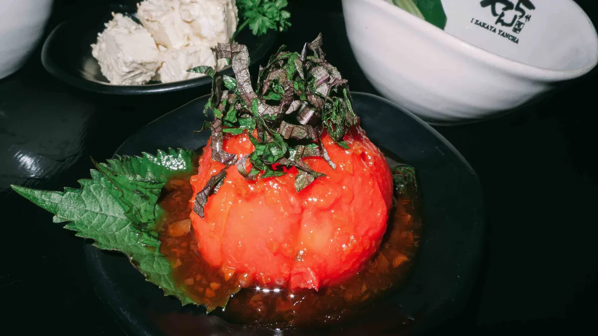 tomatoes with salted apricot vinegar and perilla.