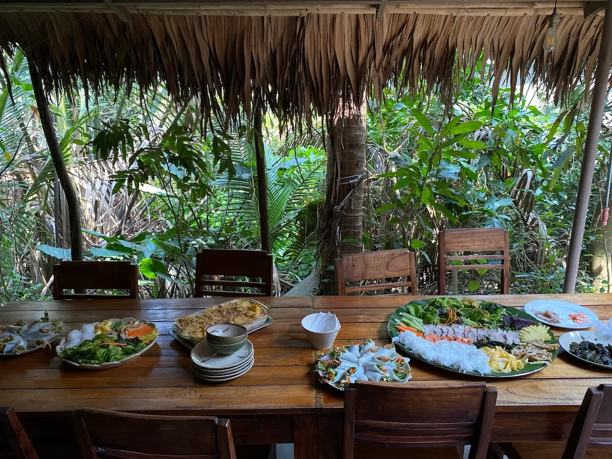 sharing lunch with everyone in the open fields of Hoi An.
